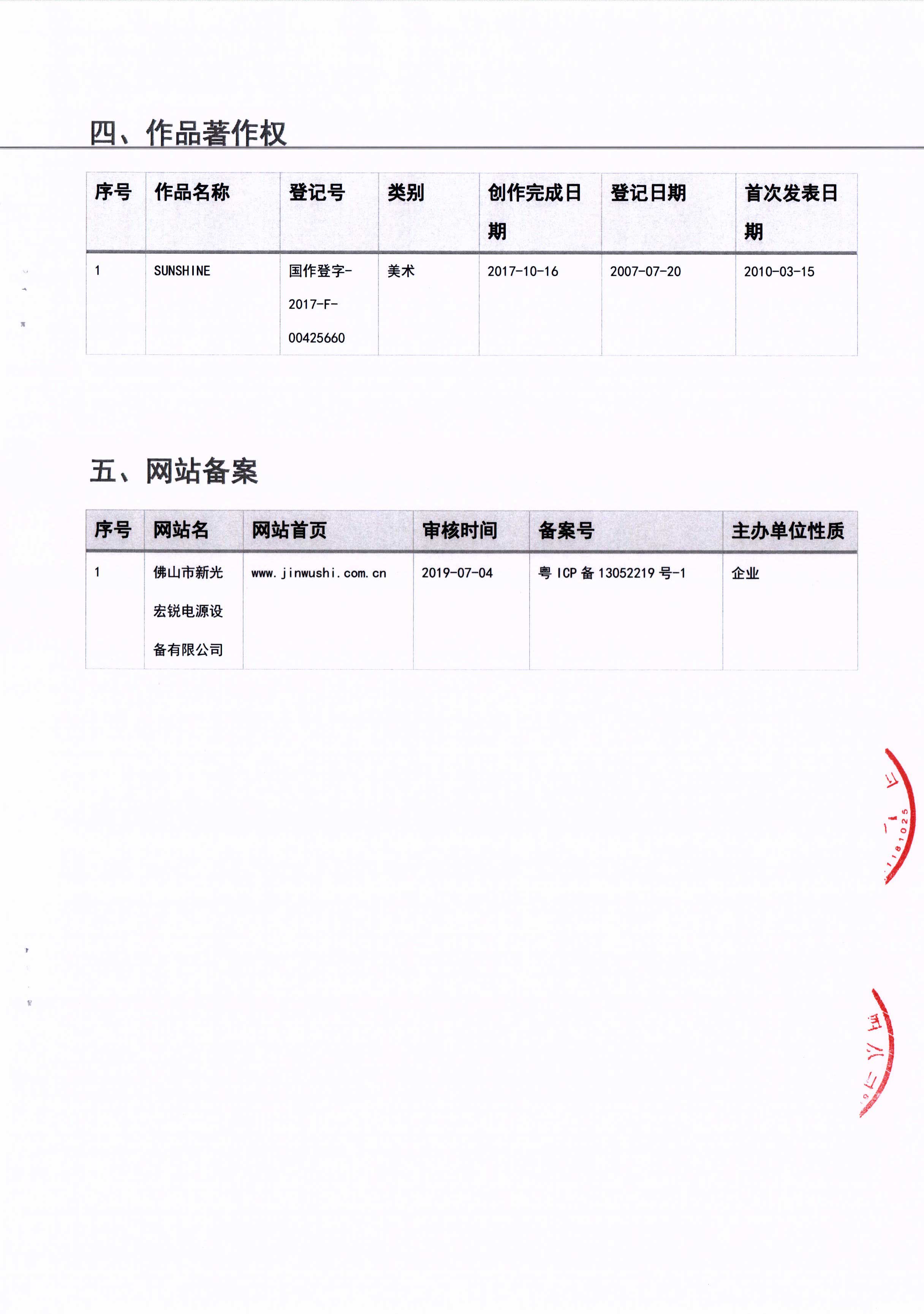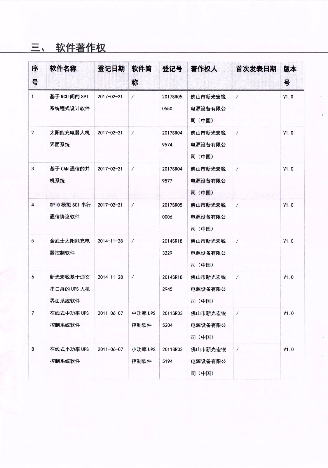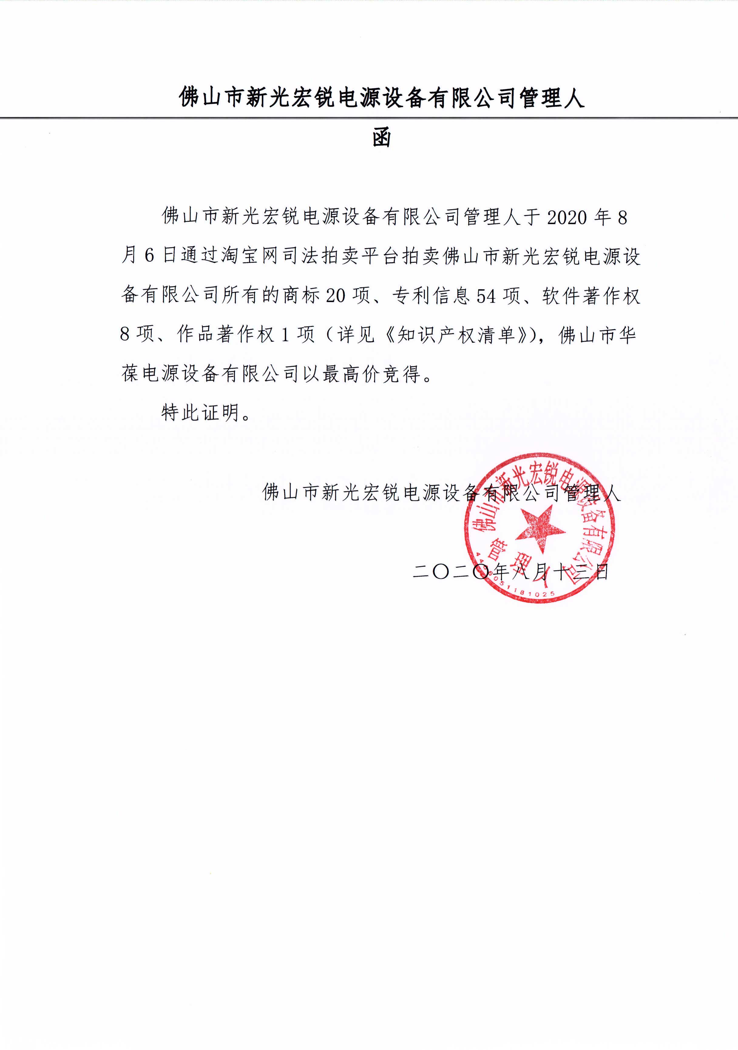 佛山市華葆電源設備有限公司2020年8月6日成功收購佛山市新光宏銳電源設備有限公司所有的商標20項、專利54項、軟件著作權8項、作品著作權1項,具體詳見《收購清單》。